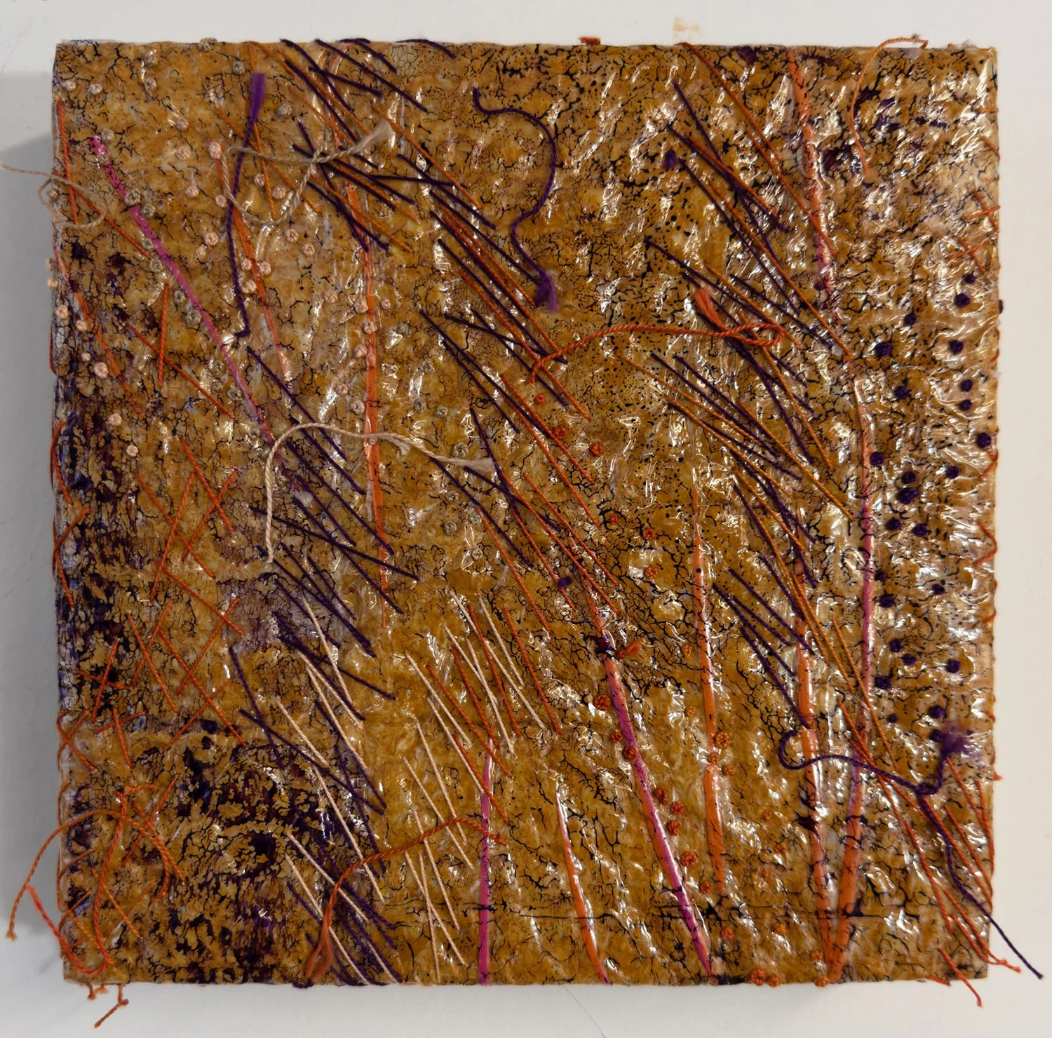 Mending 8 8"x8" single-use plastic, acrylic paint, thread, cradled board collaged, painted, stitched by hand