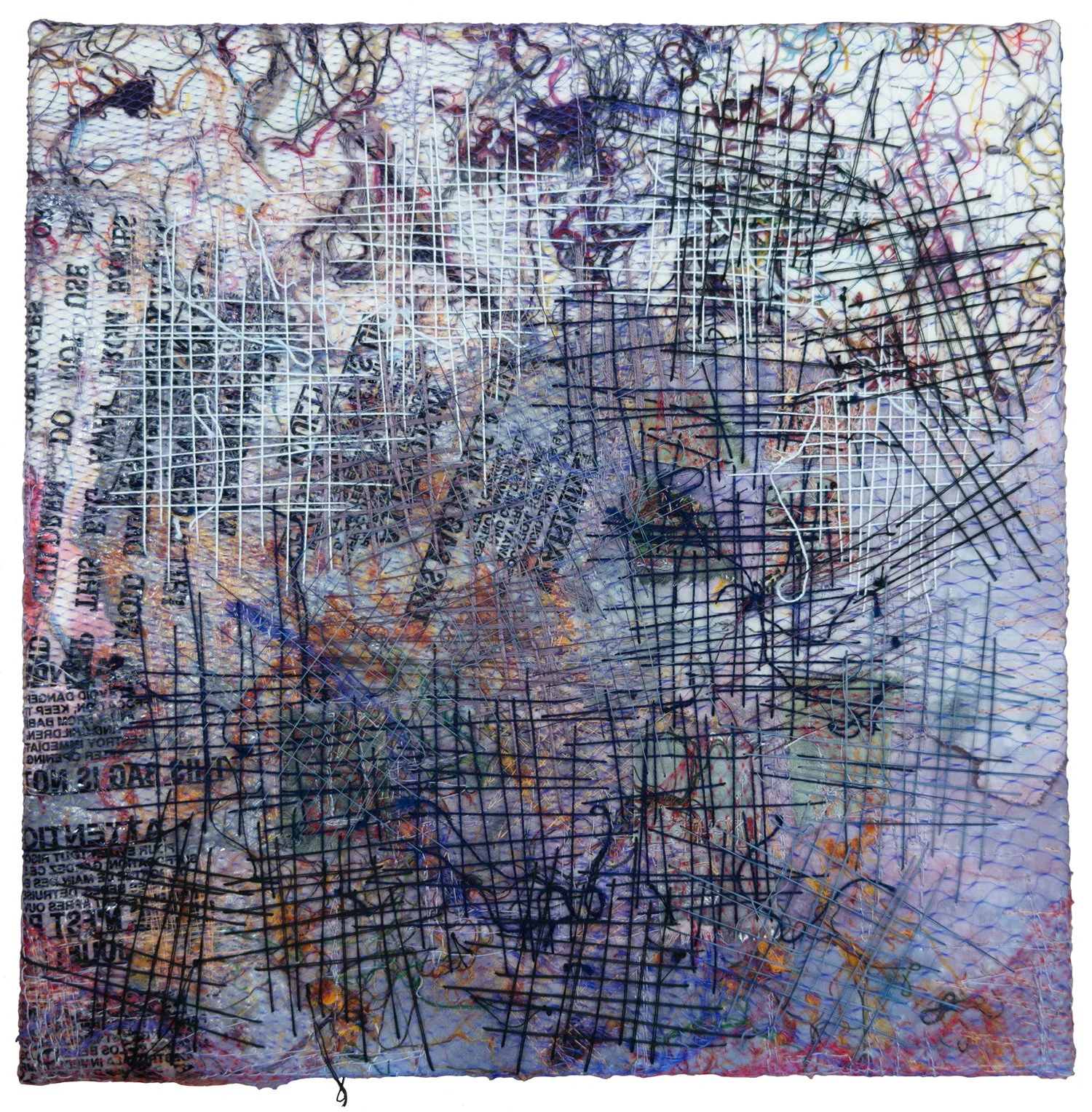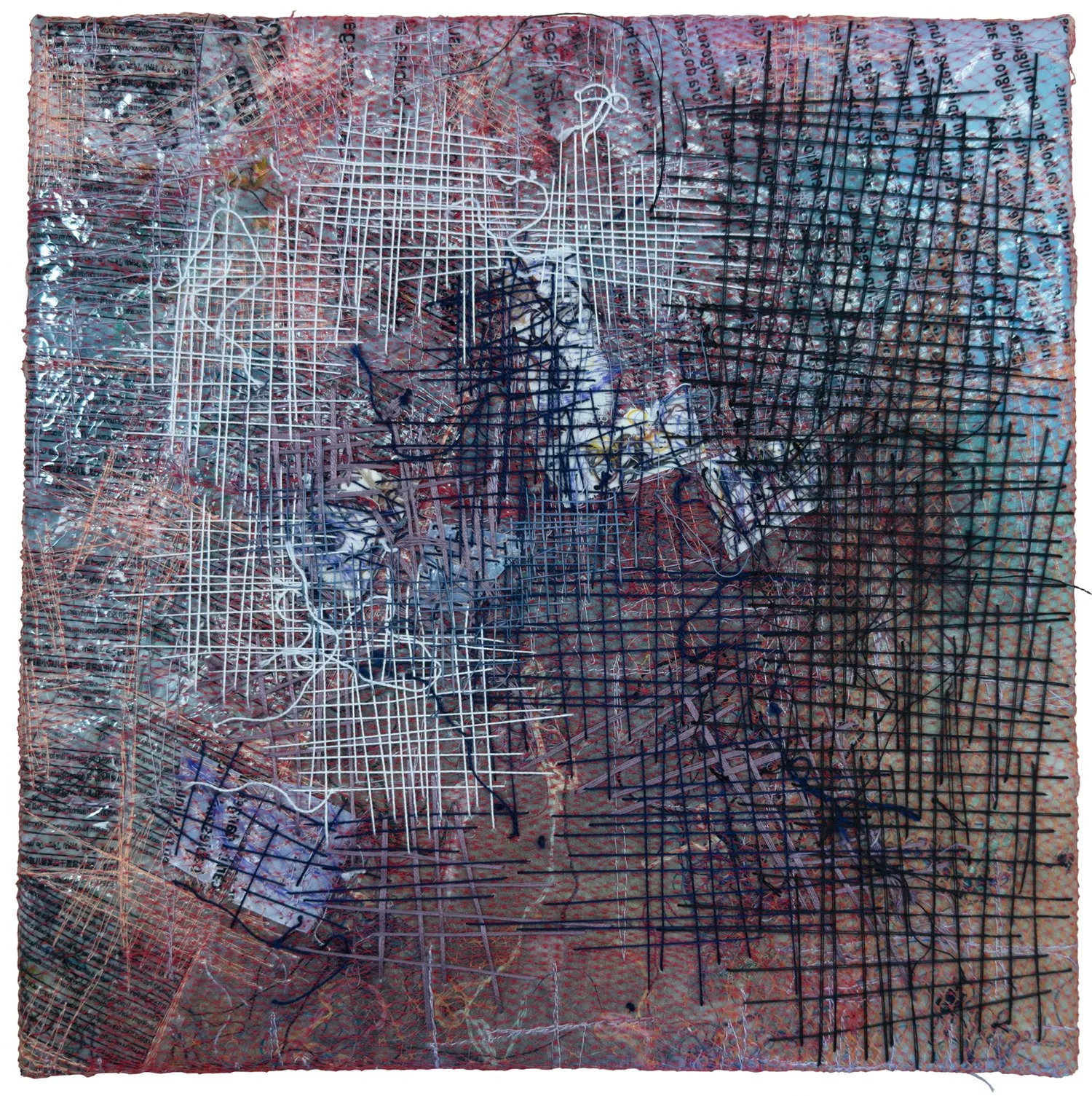 Mending 7 8"x8" single-use plastic, acrylic paint, thread, cradled board collaged, painted, stitched by hand
